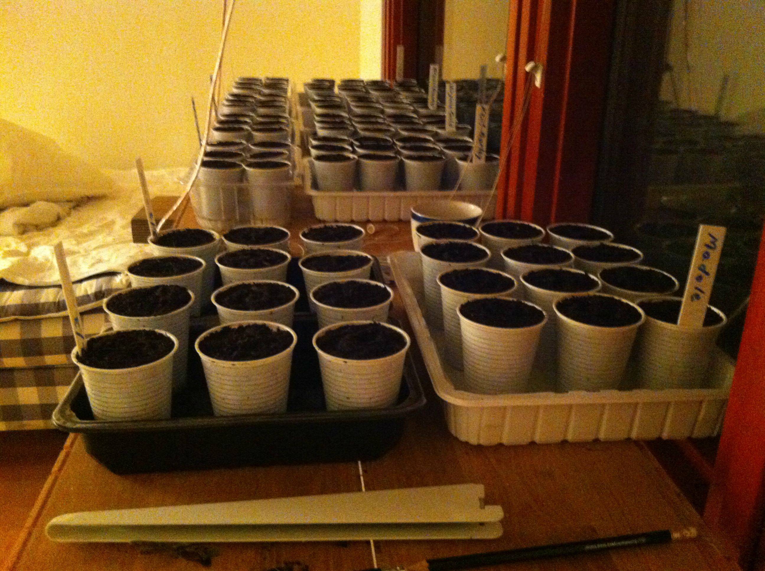 They are all sown in simple 20 cl cups/mugs where I made a few holes in the bottom and the trays are from minced meat or pork chops.