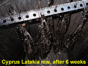We've also discussed what the actual variety of tobacco used in Latakia might be. It is clearly a Nicotiana tabacum, rather than a rustica. My impression from carefully examining some of the whole leaf Cyprus Latakia from www.wholeleaftobacco.com was that it appeared to be a small Basma-type leaf. Istanbulin is confident that the Latakia leaves do not have a petiole (a stem separating the lamina from the stalk), which would suggest a sessile type.