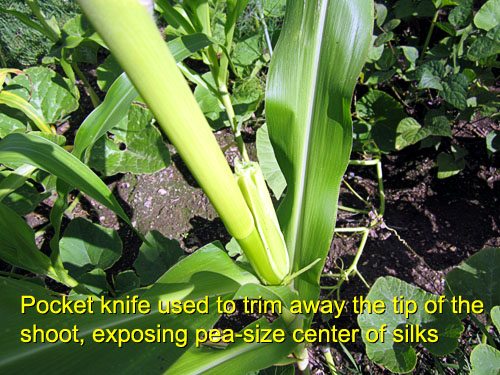 Cut the tip of the shoot down to a pea-sized core of silks.
