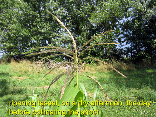 Ear shoots emerge at one or more leaf axils on the stalk. This happens shortly after the tassel appears. I wait for the tassel to mature and appear somewhat ragged (a sign that it can release pollen). The tassel must not be bagged earlier than this, or it will never produce pollen.