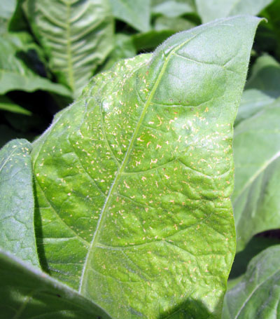 TEV is carried to your tobacco by flying aphids (rather than by those that colonize a plant later on). It would seem that an insecticide might prevent such transmission, but studies have shown that transmission occurs within seconds of the flying aphid landing on the plant, and that preventive insecticide use had little impact on initial infection or on subsequent spread.