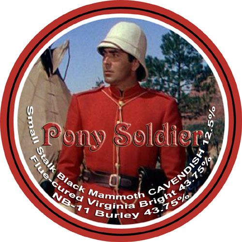 NB-11 Burley is a grower-selected variety, developed in New Brunswick, Canada. It is highly productive, cures easily, and offers a medium-to-full nicotine (typical of burley). [My NB-11 was aged in the shed for 1 year, then kilned and rested.] Pony Soldier is a blend balanced with flue-cured Virginia Bright (mid-leaf) and a CAVENDISH cooked from Small Stalk Black Mammoth, which is a Dark Air-cured variety.
