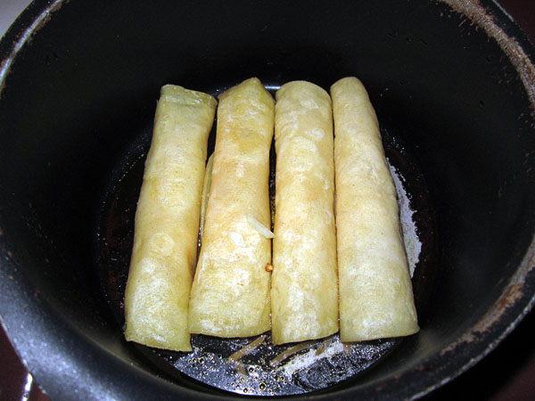 Each tortilla is placed into very hot olive oil for about 15 seconds on each side, turning them with kitchen tongs.