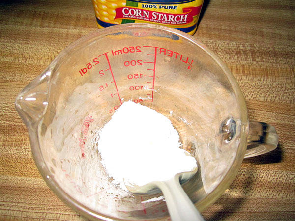 As usual in thickening a gravy, a tiny amount of liquid is added to the corn starch, in order to fully suspend it, then the remainder of the liquid is added--this done in a bowl or cup, not in the heated pot. So this can be stirred-up while the enchiladas are cooking. For the Taco Bell Mild Taco sauce, I roughly guess how much I would like to taste on a single, small enchilada, then add 4 times that to the mole sauce mixture.